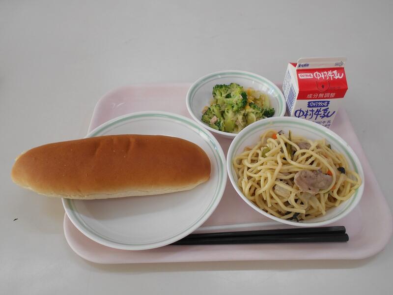 黒糖パン、きのこスパゲティ、ブロッコリーサラダ、牛乳