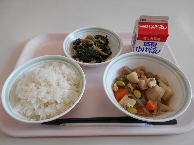 鶏肉と里芋の煮物、ほうれん草のごま和え、麦ごはん、牛乳