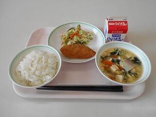麦ごはん、牛乳、サーモンフライ、野菜のレモン和え、かきたま汁