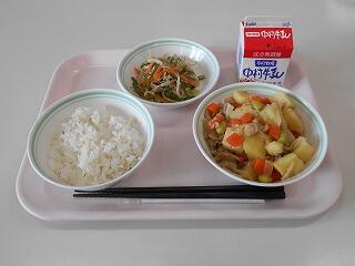 麦ごはん、牛乳、じゃがいものそぼろ煮、茎わかめの酢の物