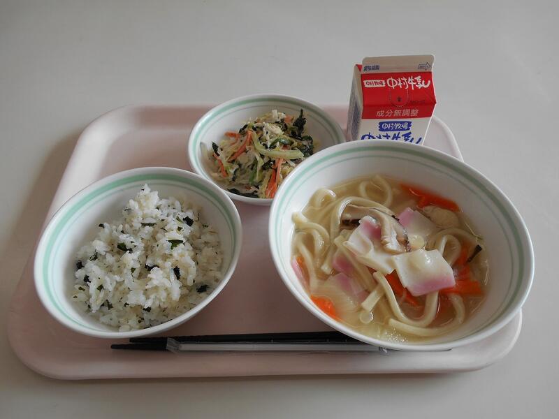 減量わかめごはん、鶏肉うどん、いそマヨネーズ和え、牛乳