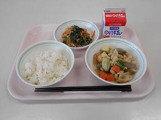 減量ゆかりごはん、さつまいもと大豆の揚げ煮、ほうとう、牛乳