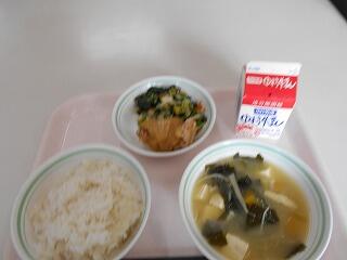 麦ごはん、牛乳、厚揚げの磯煮、りっちゃんのサラダ