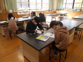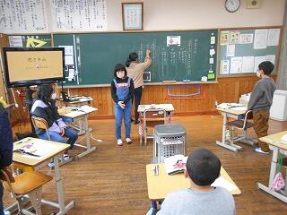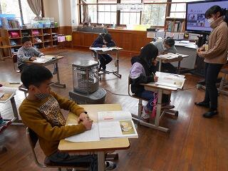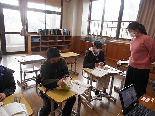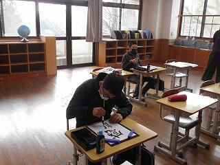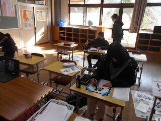 天気予報の中で雪が降るということだったので、寒くなると覚悟していました。給食後から雪が舞い、予想通りとても寒くなりました。体調を崩さないように気を付けてほしいと思います。今日は、5・6年生が習字をしていました。5年生の習字には間に合わず残念でした。6年生は、とても集中して書くことができていました。
