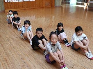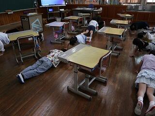 押方小では朝の健康観察が終わった後、校内放送に合わせて全校児童と学級担任が一緒に運動をしてます。手をグーパーに動かしたり、前屈や腕立て伏せをしたりしています。短時間の運動ですが、毎日の積み重ねで筋力アップや柔軟性の向上を図っています。毎朝、気持ちよく体を動かすことで、心と体の調子を整えて学校生活をがんばっています。