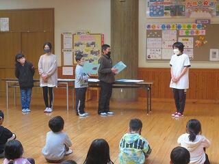 毎日のおいしい給食への感謝をする「給食感謝集会」が行われました。4人の委員会の子どもたちががんばっていました。クイズの中で、子どもたちの人気メニューの紹介があったのですが、1位は「神楽うどん」2位は「たこやきふう」でした。昨年は、1位が「たこやきふう」だったということで、少し好みが違ったようです。