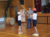 全校表現「なぎなたの舞」では、今日も上押方の坂本さん、安在さんをお迎えして、最後の指導をしていただきました。これまで3回の練習、大変お世話になりました。ありがとうございました。
