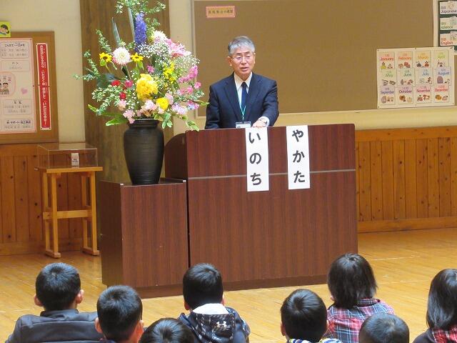 校長先生の話の中で、2つの合い言葉を目標にしてがんばりましょうと子どもたちに話されました。(「やかたの子」…やさしい子、かしこい子、たくましい子 「いのち」…いじめゼロ!、のばそう!〈学力と体力〉、チャレンジ!)