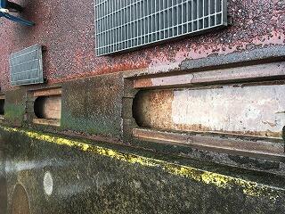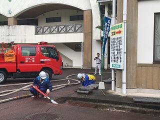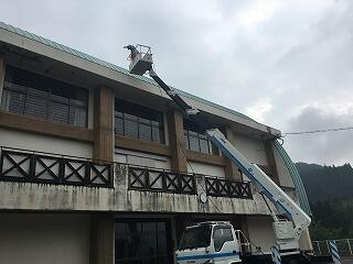 【↑高所作業車を使って樋の洗浄】 【↑消防用ホースを使用して側溝の洗浄】