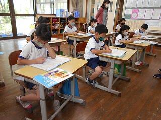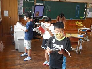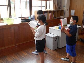 朝の活動で図書委員の4~6年生が、全学年に読み聞かせを行いました。練習はしていたんですが、緊張したようでした。それから、フッ化物洗口もありました。様々な活動にしっかり取り組んでいました。
