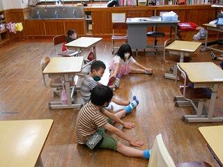 子どもたちが毎日取り組んでいる「ストレッチ」の写真を紹介します。それから、フッ化物洗口もありました。5・6年生は、跡取り川の見学を行いました。あいにくの雨でしたが、計画していた活動はできたということです。