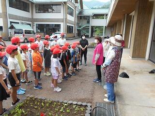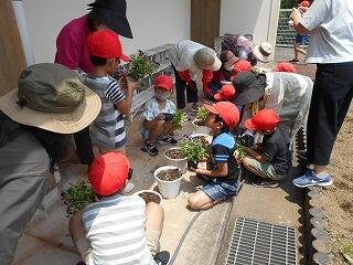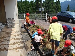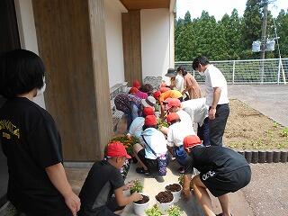 昼休みに、地域の方に来ていただいて花の苗植えをしました。一人一鉢の花と学級園、それから、児童玄関前のプランターに花を植えました。少し暑かったですが、しっかりと植えることができました。協力してくださった皆様に感謝です。