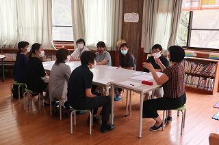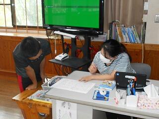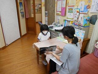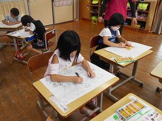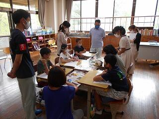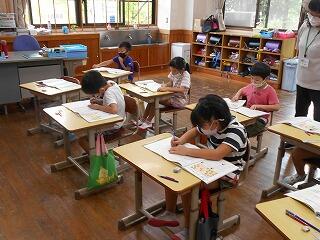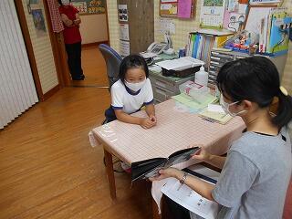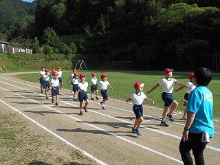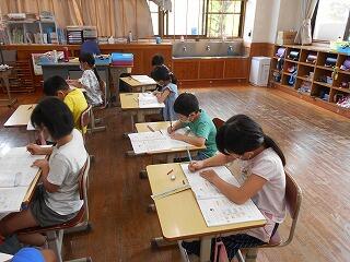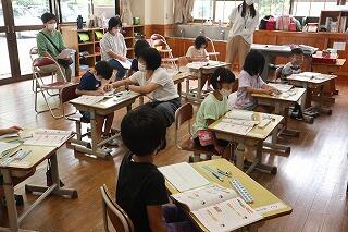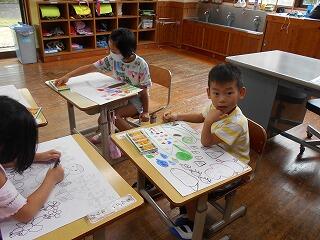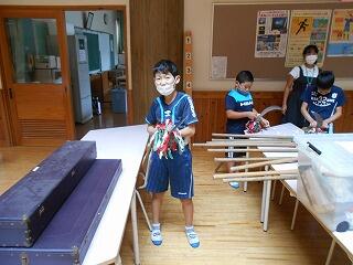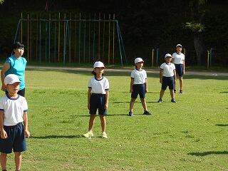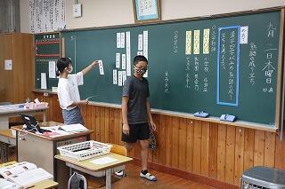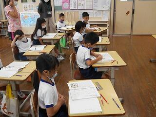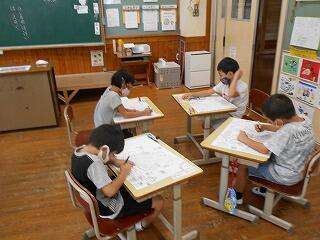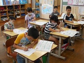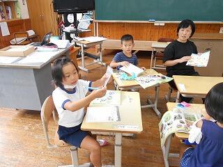1年生が、夏休み中に各家庭で観察とお世話をしていた「あさがお」からとれた種を確認しながら、生活科の学習をしていました。たくさんとれていたようで、「こんなにとれたよ。」と見せてくれました。2年生は、生活科で1年生を招待して遊ぶための道具を考えていました。4~6年生は、リレーのバトンの練習でした。どの子もがんばっていました。