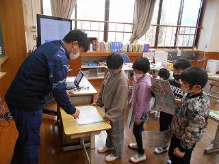 今朝は、高千穂町役場、総合政策課の方が2名来校され、6年生にユネスコエコパークのしおり贈呈式が行われました。卒業する6年生5名に菊ノ宮神社のご神木から作られたしおりが送られました。高千穂町内の小学6年生に贈られるそうです。宮日と夕刊デーリー新聞の方がこられていたので、記事にしてくれるのかもしれません。6年生の代表がインタビューに答えていました。読書をする中で、しおりを見るたびにユネスコエコパークについて思い出してもらいたいということでした。
