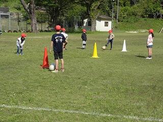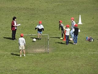 ◎ シュートゲーム:好きなコーンの位置からゴール目指してキックします。遠いほど点数が上がります。
