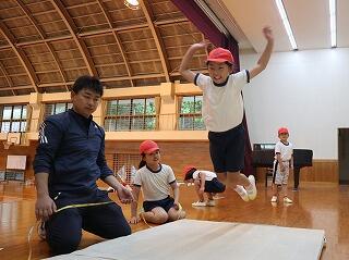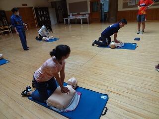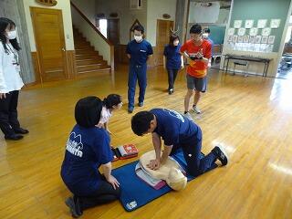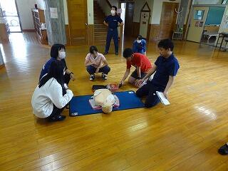 5月17日(水) これからのプール学習や熱中症対策として、西臼杵広域行政事務組合消防本部及び高千穂町女性消防団から講師をお招きし、職員に対する救急救命講習を行いました。DVDで理論を学んだり、心肺蘇生法を全員で体験したりしました。また、実際の場面を想定した訓練とAED操作の確認もしました。