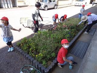 5月24日(水) 1年生が花壇の草取りをしました。花と花の間にびっしり大きくなっていた草をみんなでひいてくれました。花壇がとてもすっきりになりました。