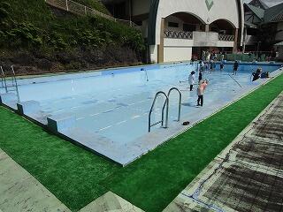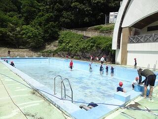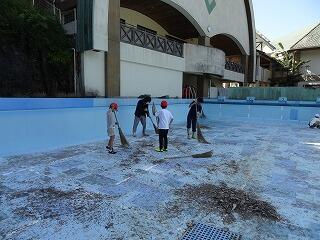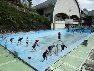 5月24日(水) 26日のプール掃除の前に、3・4年生が、プールの底に残っていた落ち葉を片付けてくれました。