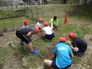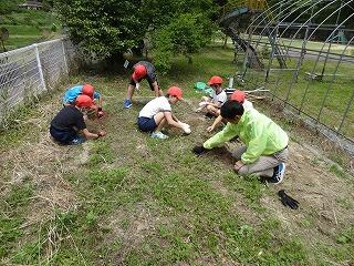 5月25日(木) 自分たちで野菜を育てるために、6年生が畑の草取りをしました。草がずいぶんと大きくなっていたので取りにくそうでしたが、6人で力を合わせ、きれいに草取りができました。
