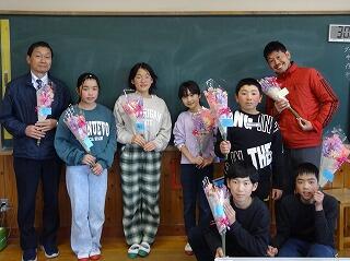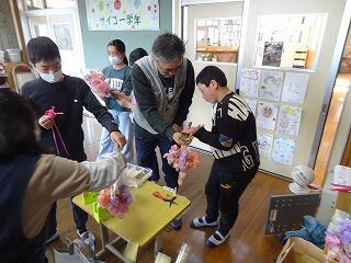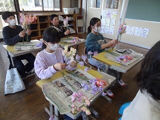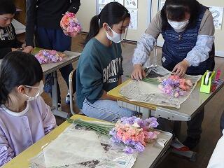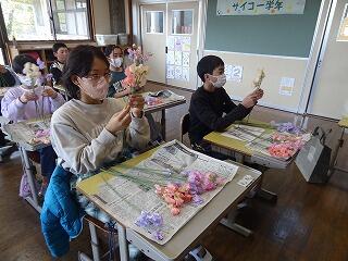 3月22日(金) 4時間目、地域の花農家の方を講師に花育教室を行いました。花育とは、「花や緑に親しみ、育てる機会をとおして、やさしさや美しさを感じる気持ちを育むこと」(農林水産省)です。講師の方から花束の作り方を教えていただき、花束作りに挑戦しました。一本一本のスイートピーの花をきれいにまとめるために試行錯誤しながら作ったこの花束は、卒業式の日に保護者へ感謝の気持ちと一緒に届ける予定です。