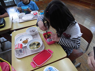 今日は、「チャレンジ給食」の日でした。「チャレンジ給食」とは、「弁当の日(遠足時)」に向けて、給食の献立を使って自分でおにぎりをにぎったり、おかずを弁当箱に詰めたりする体験、いわば、「弁当の日」への意欲付けと練習の場です。