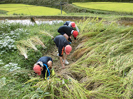 この秋空の下、5・6年生の田んぼの稲刈りもようやく実施できました。台風の影響で稲は倒れていましたが、全員鎌を使って刈り取り、刈った稲を集めてひもで縛り、最後に、学校のフェンスに掛け干しまで済ませることができました。「収穫の秋」にやはり太陽は欠かせませんね。