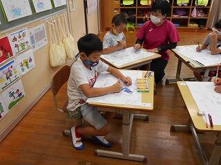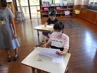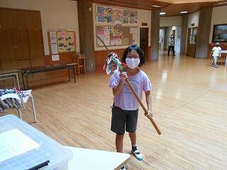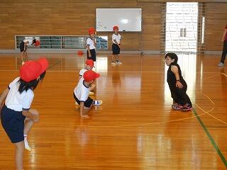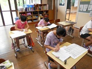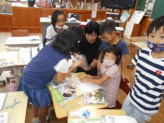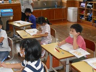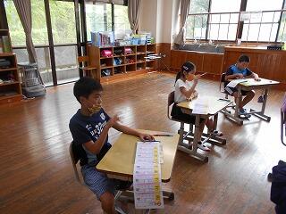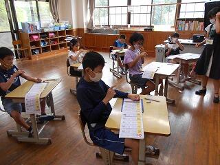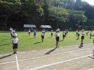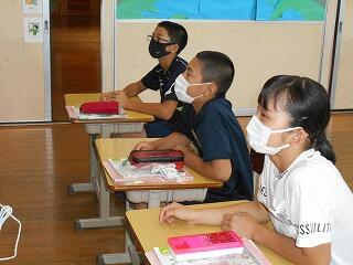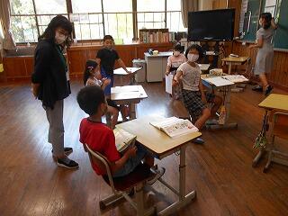 1年生が、夏休み中に各家庭で観察とお世話をしていた「あさがお」からとれた種を確認しながら、生活科の学習をしていました。たくさんとれていたようで、「こんなにとれたよ。」と見せてくれました。2年生は、生活科で1年生を招待して遊ぶための道具を考えていました。4~6年生は、リレーのバトンの練習でした。どの子もがんばっていました。