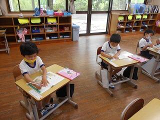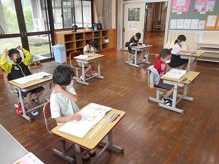 今日は、1年生が体育館で体力テストの練習をしていました。腹筋のやり方や幅跳びなどのやり方を確認していました。本来であれば、体力テストを行う時期なのですが、子どもたちの体調を見ながら、実施時期を考えているところです。運動場を走り回るようにならないと体力が戻らないのではないかと心配しているところです。