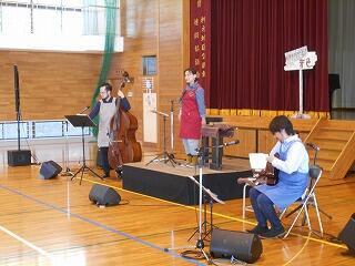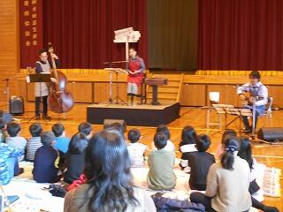 チャルネイロという演奏団体をお迎えして、音楽鑑賞教室を行いました。お芝居仕立てのコンサートということで、街角にある小さなギフトショップ「音色」というお店の店員さんが、全員ミュージシャンという設定でのコンサートでした。子どもたちが知っている歌などを披露していただきました。その中で、5年生の興梠珠奈さんの「めだか」という詩に曲をつけて歌ってくださいました。そして、「名前」という曲では、子どもたち全員の名前が歌の中に出てくるなど、とても楽しい演出がなされていました。子どもたちは、大満足のコンサートになりました。とても楽しい時間を過ごすことができました。