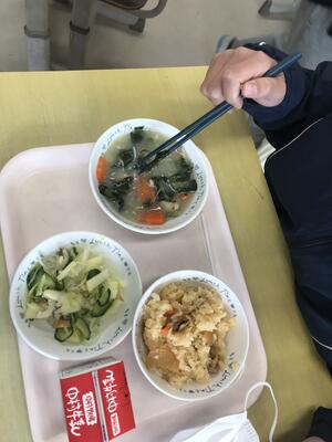 キムタクご飯、きのこのみそ汁、りんごサラダというメニューでした。