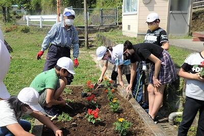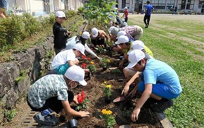 4年生と5年生です。マリーゴールドとサルビアを移植しました。