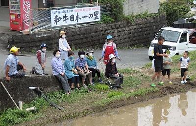 校長先生は、初めての田植え。3年生が、校長先生の実力を見ています。
