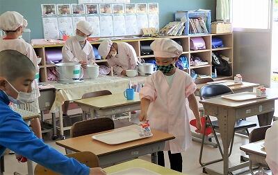 明日25日は卒業式、本日の給食は6年生にとって、小学校最後の給食でした。給食室に受取に行った子供達は、6年間の感謝の気持ちを調理員さんに伝えた後、給食をいただきました。今日まで今週3日間の献立は、6年生のリクエストメニューでしたが、最終日はわかめご飯、唐揚げ、すまし汁、レモン和え、そしてデザートでした。今年は、コロナ禍の影響下グループで会食することはできませんでしたが、おいしい給食と同時に思い出を噛みしめた卒業生でした。これまで調理していただいた調理員の皆様ありがとうございました。