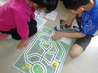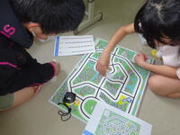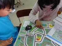 地図に「右に曲がれ」「一時停止」などの命令を示すシールを貼り、地図上のロボットを思い通りに進ませる活動です。ロボットが進むたびにみんな「すごーい!」と大喜びでした。楽しみながら学べる、良い時間になりました。