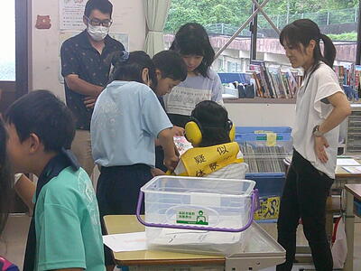 保健所から来てくださった職員のご指導の下、装置を使って川の色やにおい、近くの音などを五感を使って感じました。
