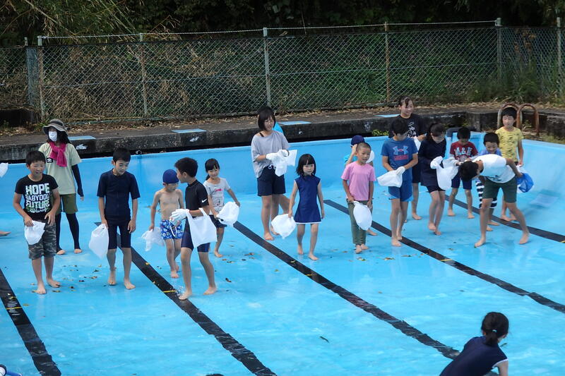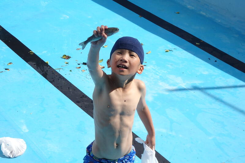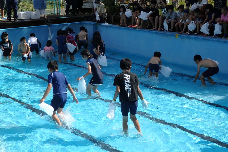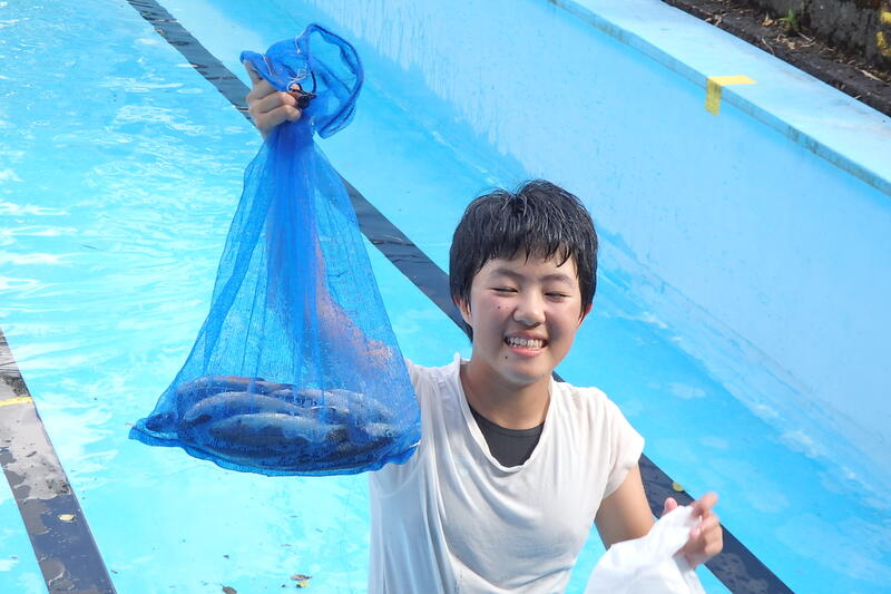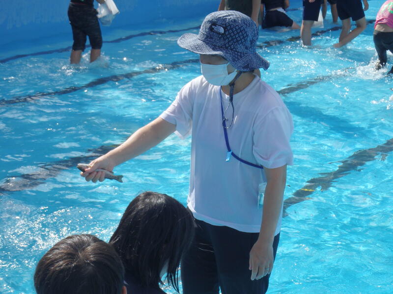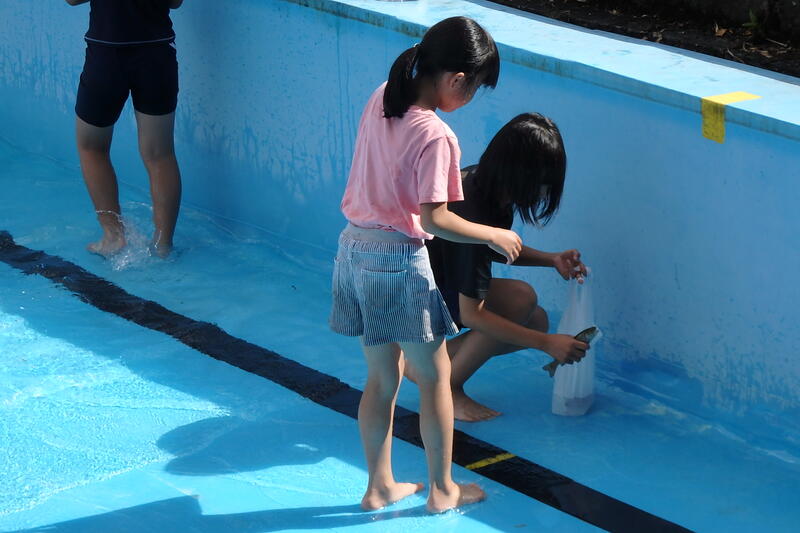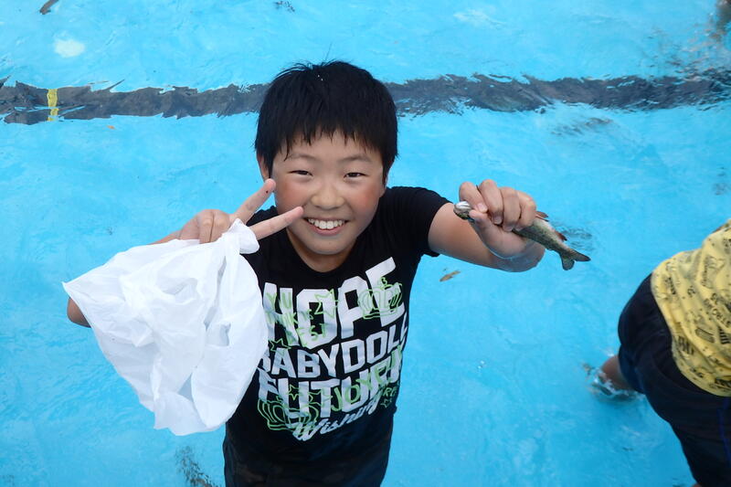 5年生が、1年生に魚をとってあげるなど、上級生が下級生に優しくする姿が、数多く見られました。