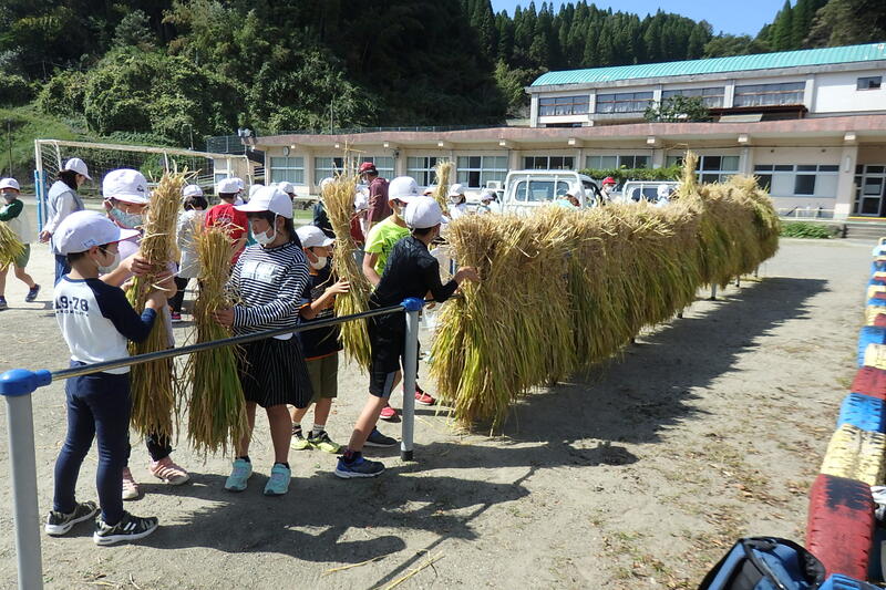 学校の鉄棒に掛け干ししました。天日に干すことで、さらにおいしいお米に仕上がります。