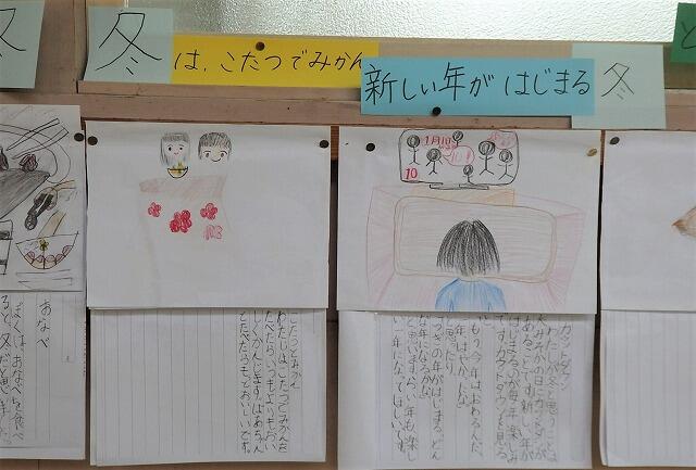 1年生の掲示板に、冬休みの思い出が、掲示してありました。