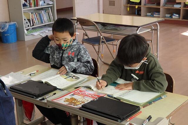 1年生が、姿勢良く 何かを 書いています。
