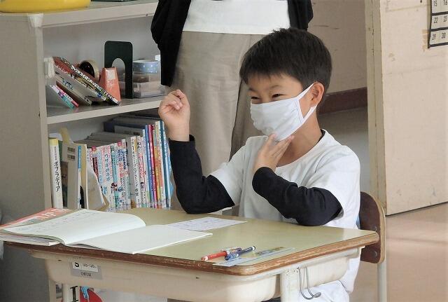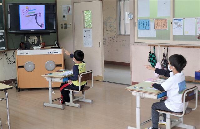 1年生が、新しい漢字の学習をしています。大型投影機に映されたアニメーションで、書き順の確認です。