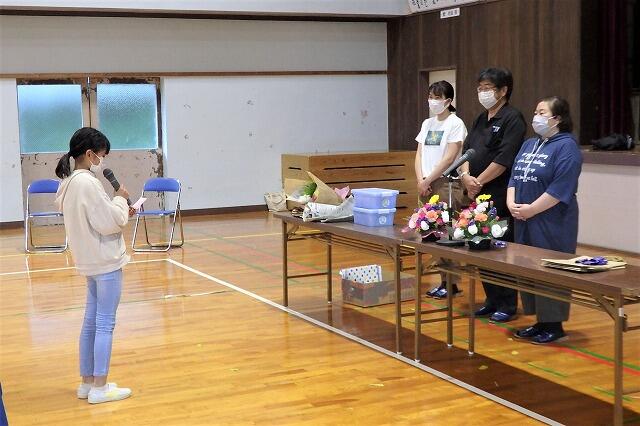 児童代表の作文発表では、転入してきた3年生が「計算をがんばった」「友だちと仲よくした」「なわとびの二重とびをがんばった」ことを堂々と述べました。