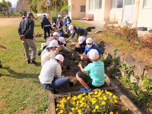 田原っ子たちも学年の花壇に、パンジーやキンギョソウ、アリッサムを移植しました。