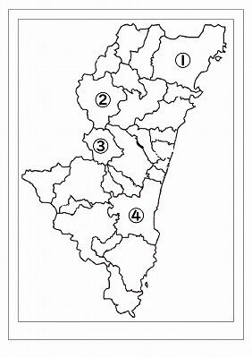 4年生への挑戦状です。①~④の市町村名を漢字で書きましょう。