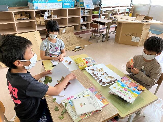 学校や家の近くに落ちていた「落ち葉」で、「葉っぱのアート」づくり(生活科)を行いました。