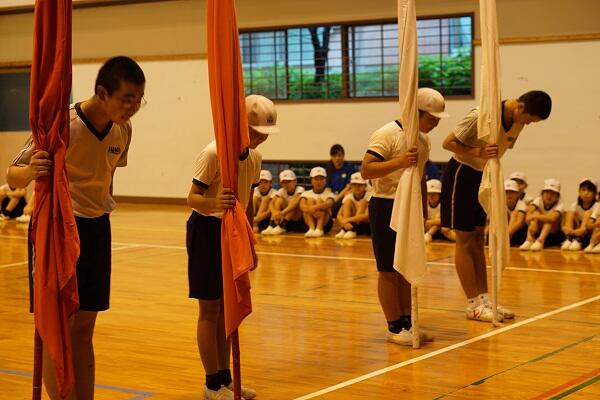 A・Bの団長・副団長・リーダーがゲームを行って、団色を決定し、各団の団長が校長先生から団旗を受け取りました。