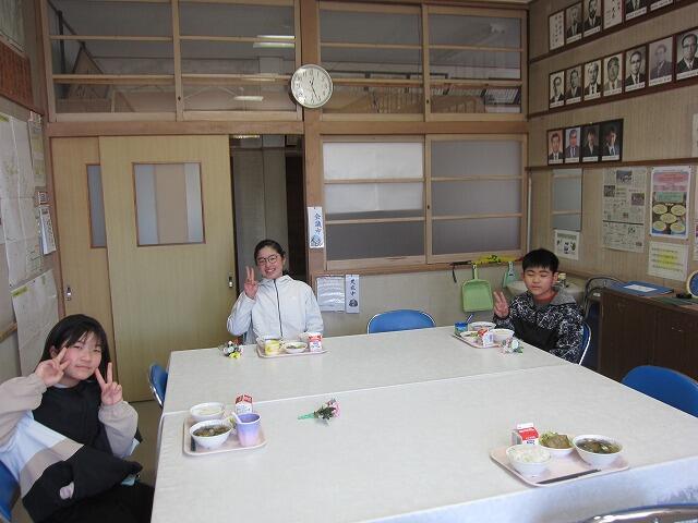 卒業を前に校長室で6年生と一緒に給食を食べました。中学校のこと、将来のことなど話が盛り上がりました。