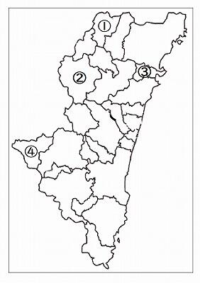 ① ~ ④ の 市町村名を 漢字で書きましょう。