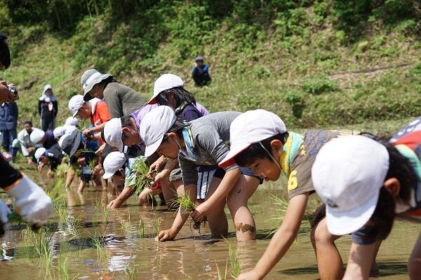 たくさんの保護者の方々やJA青年部の方々に協力していただき、1枚の田んぼを2時間程で植え終えることができました。