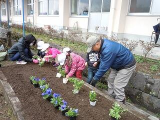 今日は,地域の老人クラブの方々と花壇やプランターに花の苗を植えました。