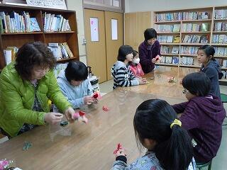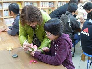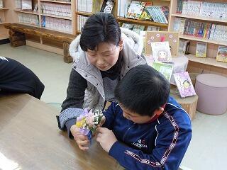 地域の更正保護女性会の方々と一緒に、5年生13名が卒業生へ贈るコサージュ作りをしました。
